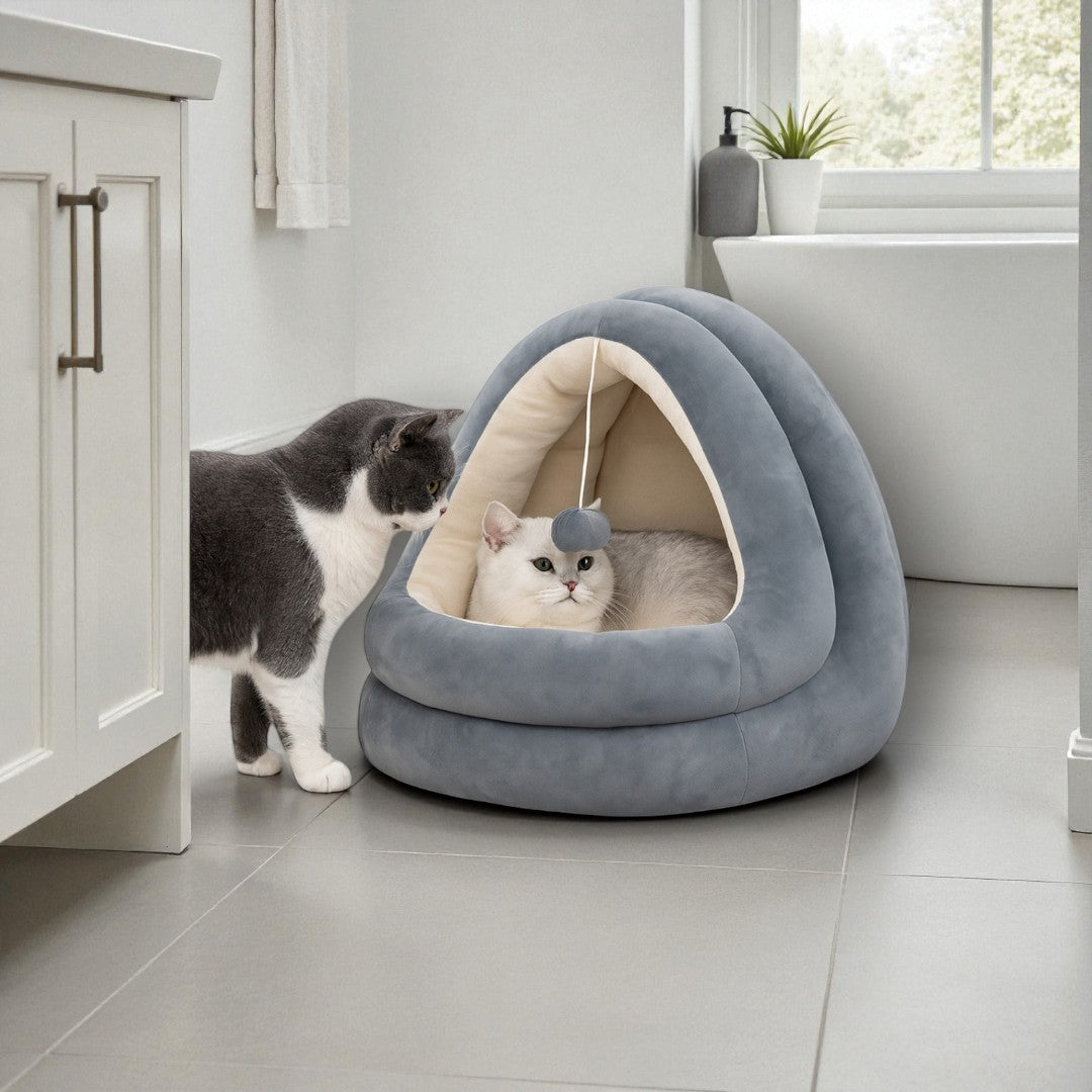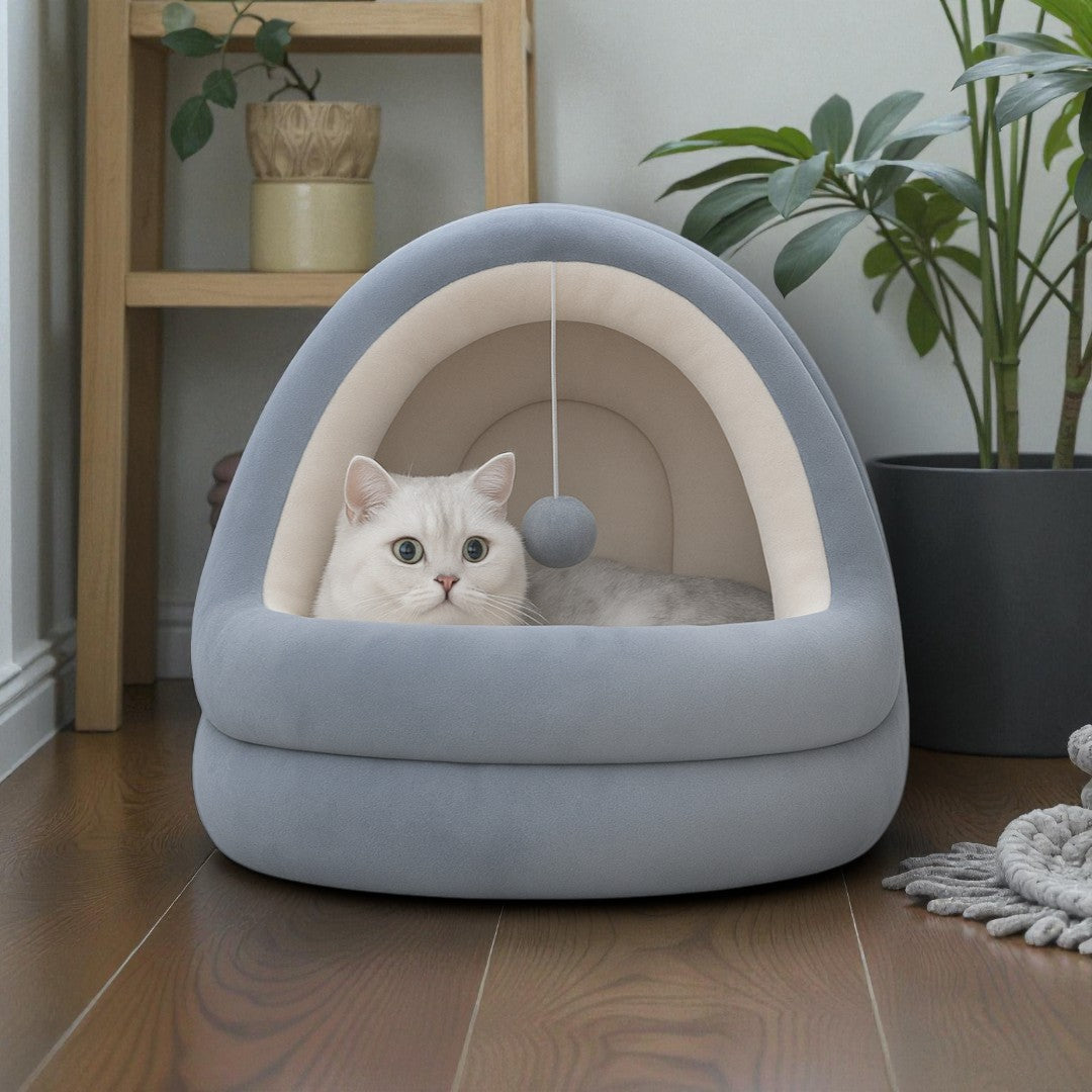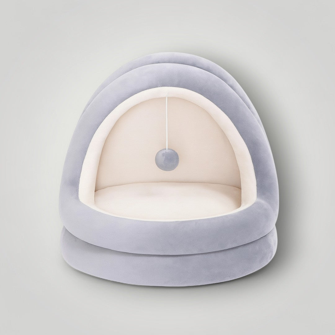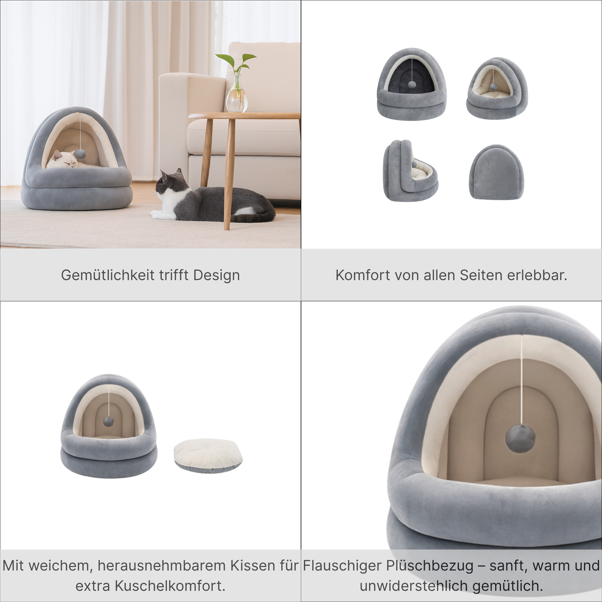 Weiche, halboffene Katzenhöhle aus samtigem Plüsch in elegantem Grau.