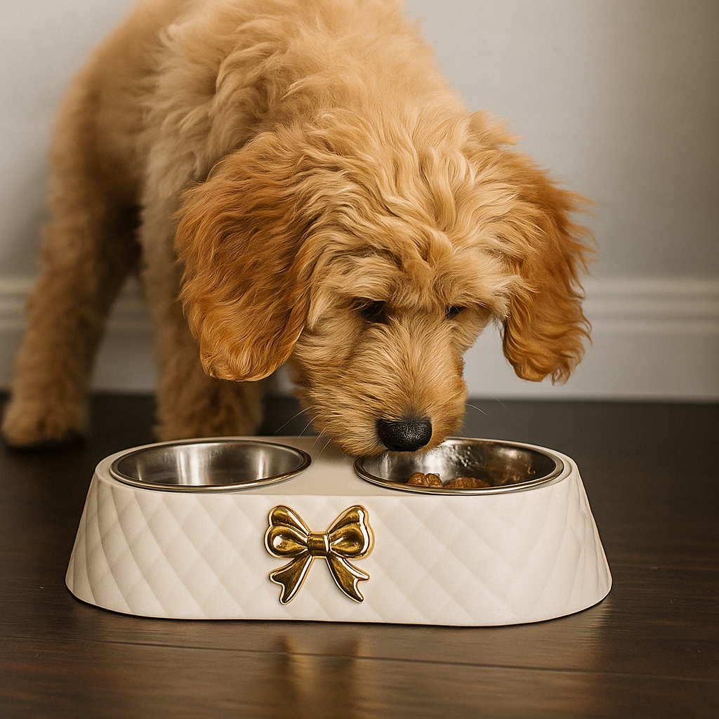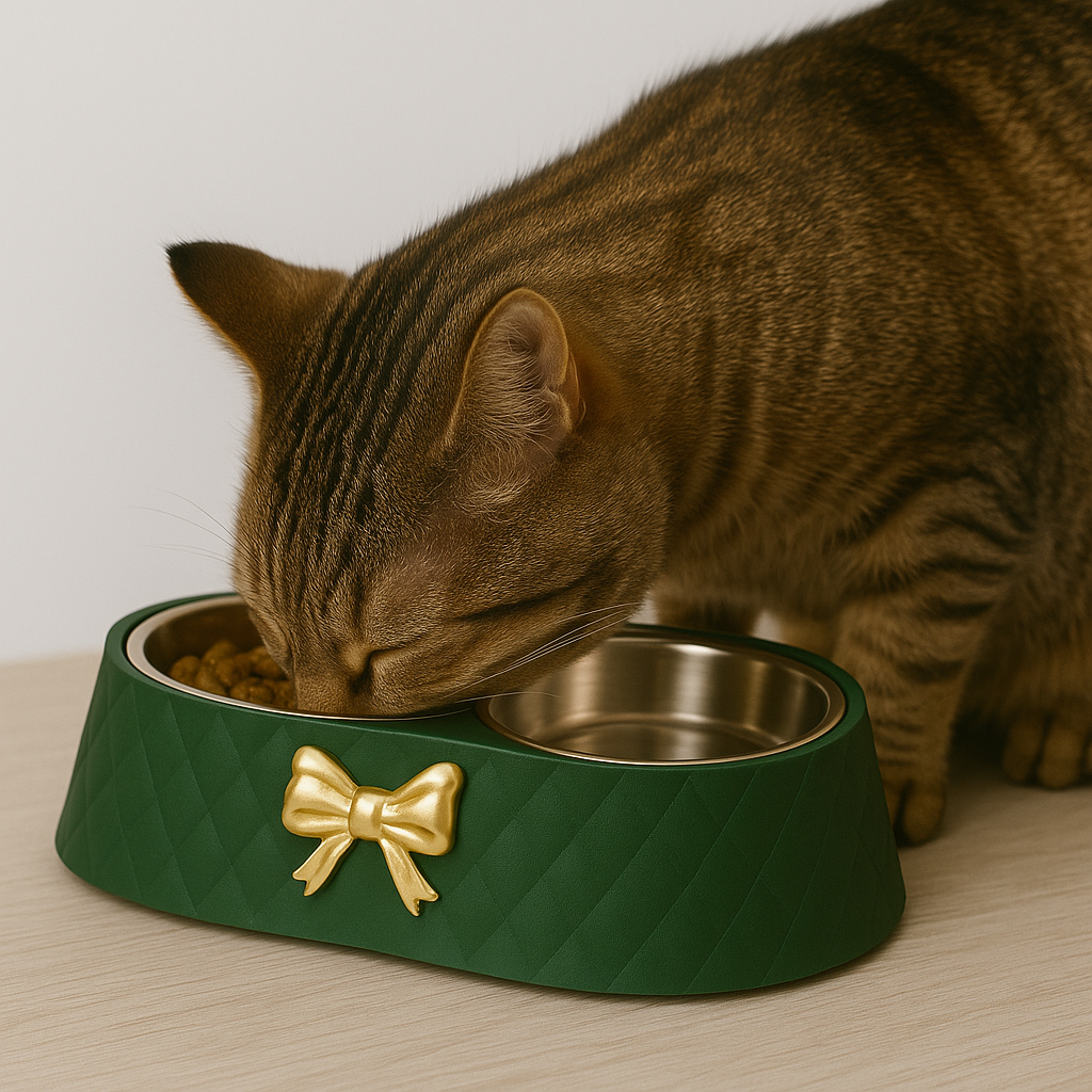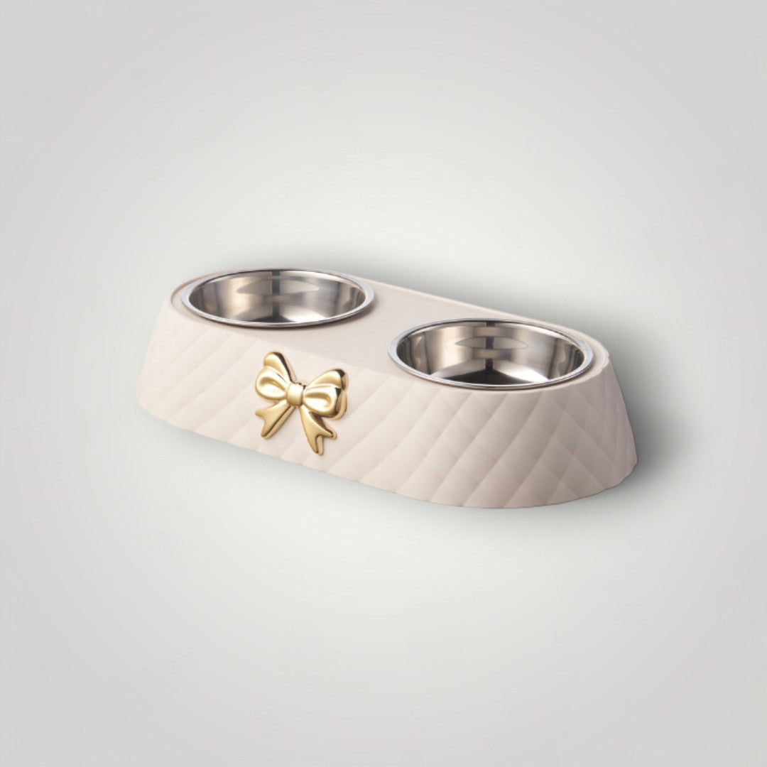 Das elegante Design mit goldener Schleife fügt sich perfekt in jedes Zuhause ein, während die leicht erhöhte Position die Nackenbelastung deines Lieblings reduziert.